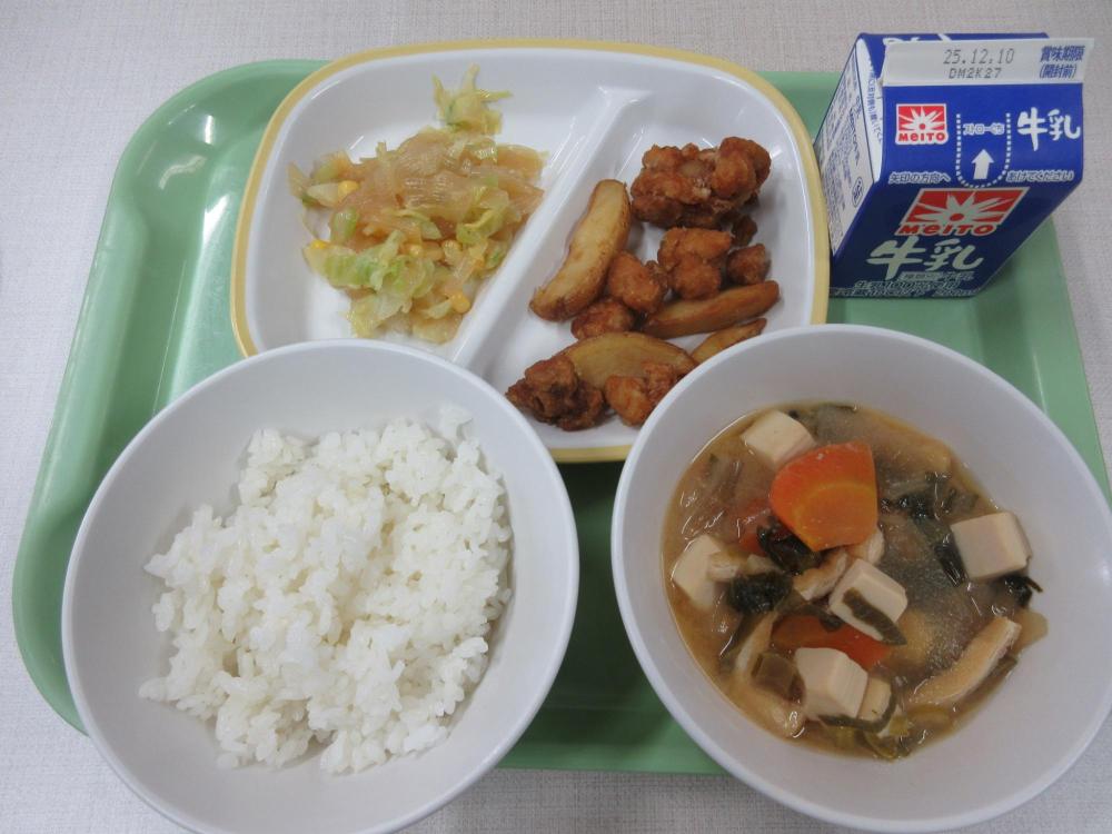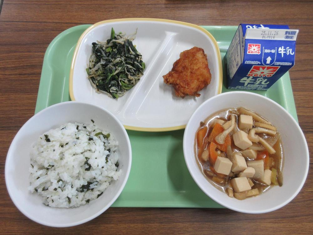 ワカメご飯 海苔和えサラダ 唐揚げ 田舎汁 牛乳