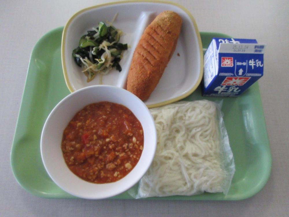 ソフト麺 ミートソース きな粉揚げパン わかめサラダ 牛乳