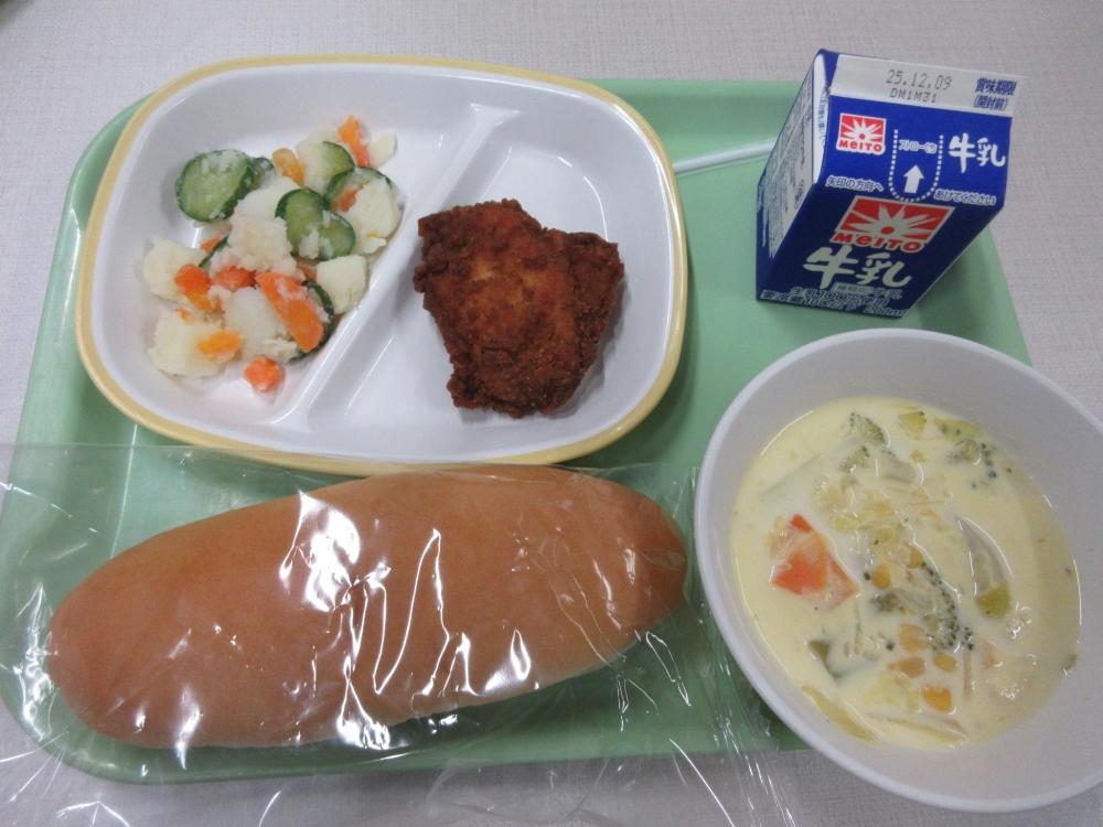牛乳 コッペパン フライドチキン ミルクスープ コロコロサラダ