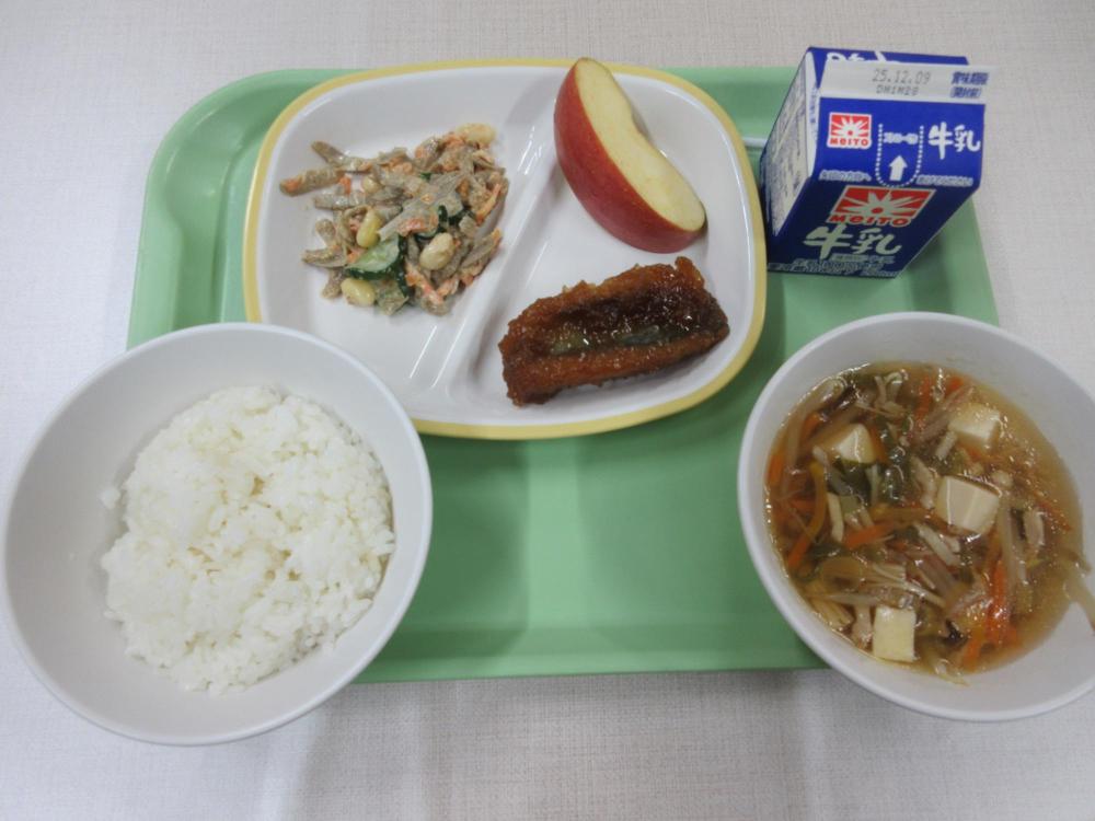 ご飯 沢煮椀 鯵の揚げ煮 ごぼうマヨサラダ りんご 牛乳