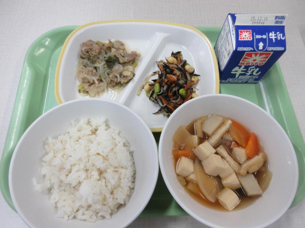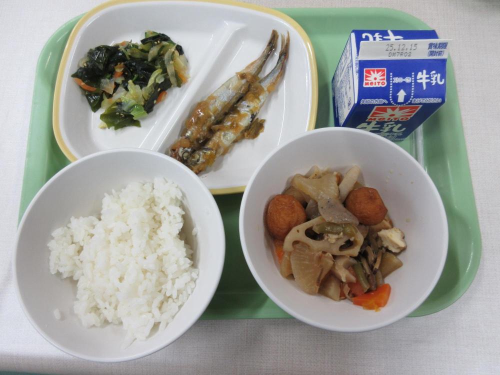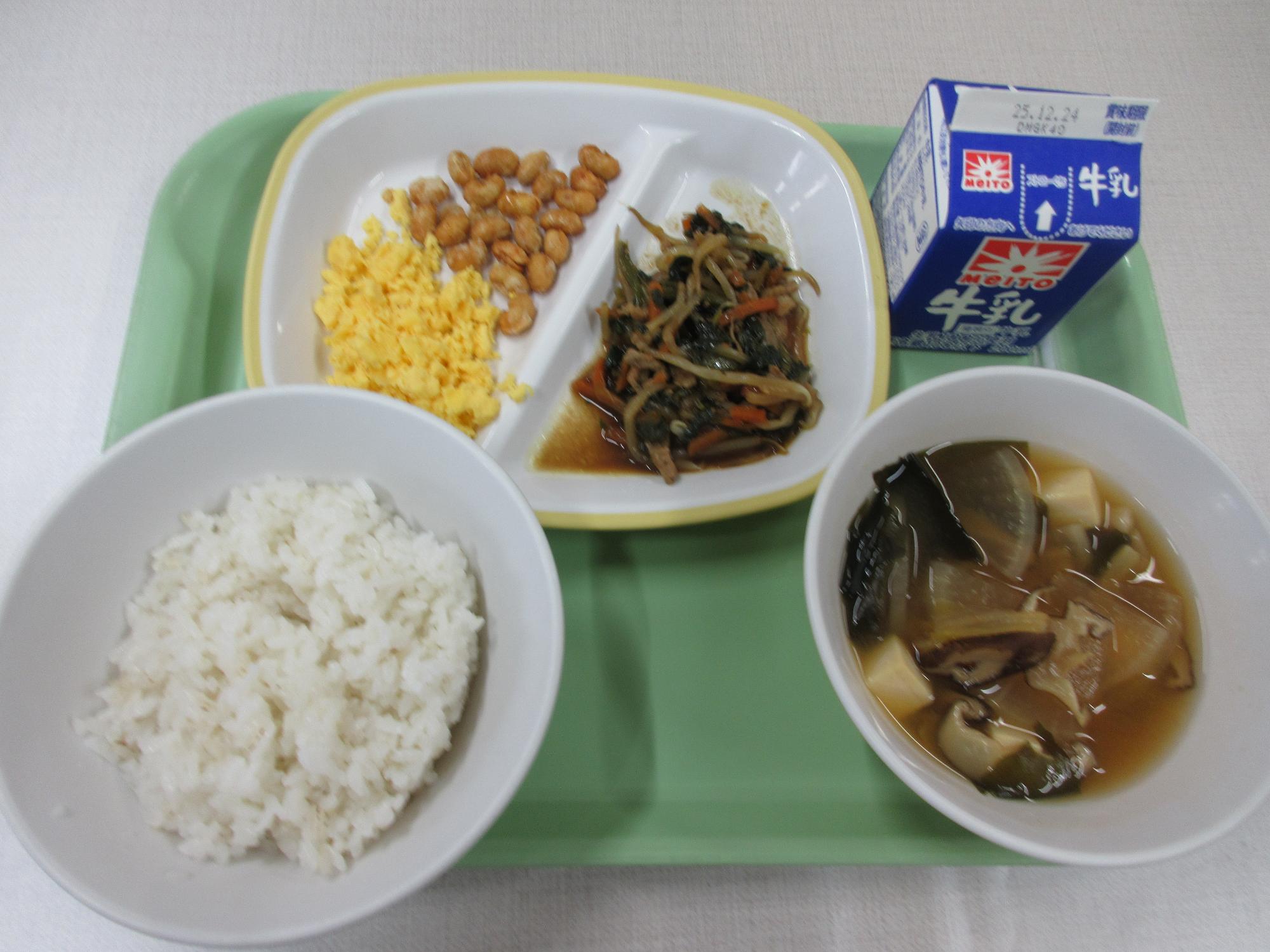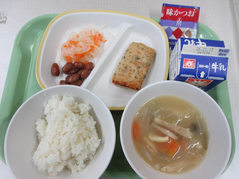 ご飯 松風焼 すいとん雑煮 紅白なます 金時豆の甘煮 牛乳 かつおふりかけ