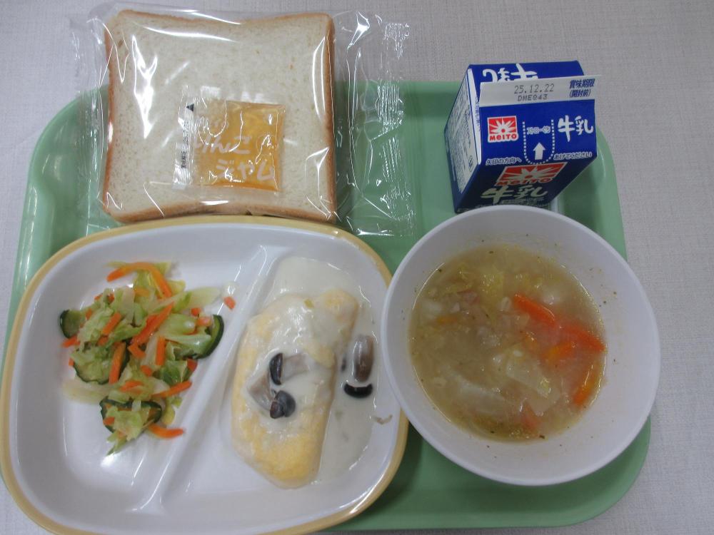食パン オムレツ茸クリームソース 麦とジャガイモのスープ リンゴジャム 牛乳