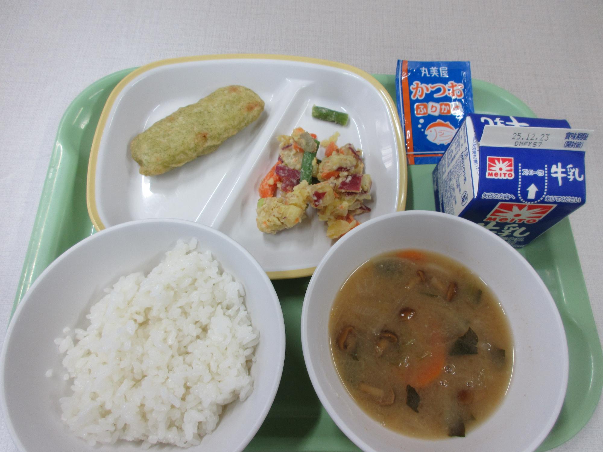 ご飯 蒲鉾の磯部天ぷら なめこ汁 サツマイモの胡麻サラダ かつおふりかけ 牛乳