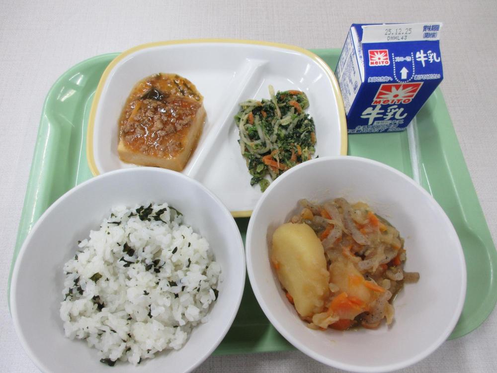 ワカメご飯 豆腐ステーキそぼろ餡 肉じゃが 胡麻和え 牛乳