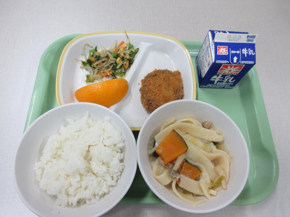 ご飯 イワシの山河フライ ほうとう コーンと小松菜の和え物 オレンジ 牛乳