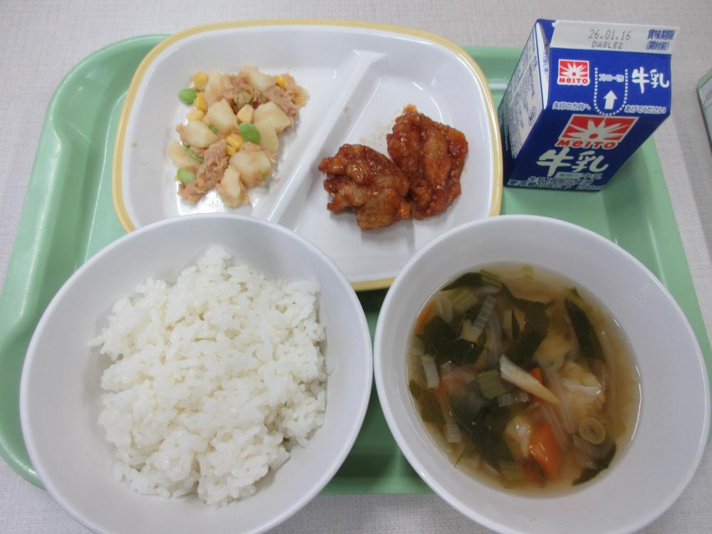 ご飯 ヤンニョムチキン 中華風ツナポテトサラダ お魚ボールのスープ 牛乳