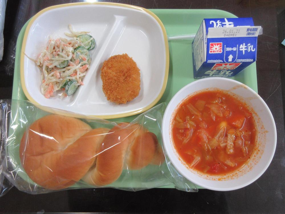 はちみつパン クロケット風 トマトスープ ちくわ胡麻ネーズサラダ 牛乳