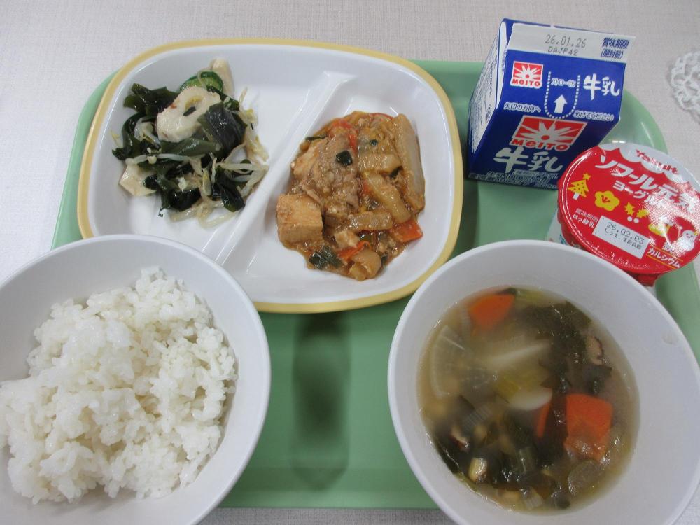 ご飯 生揚げのキムチ炒め トックのスープ 竹輪とワカメのサラダ 牛乳 ヨーグルト