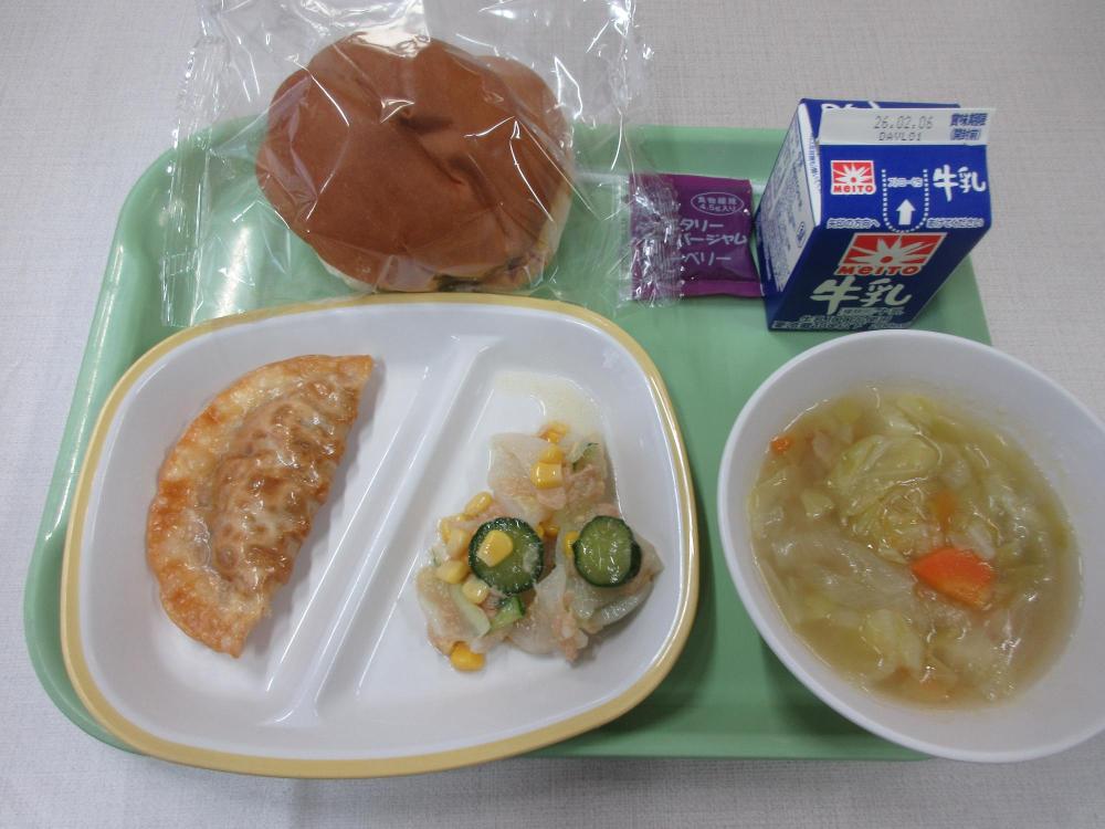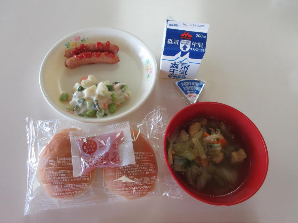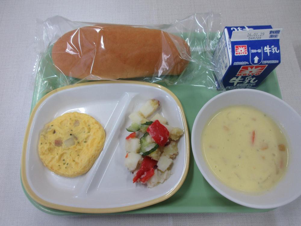 コッペパン フリッタータ コーンポタージュ マセドアンサラダ 牛乳