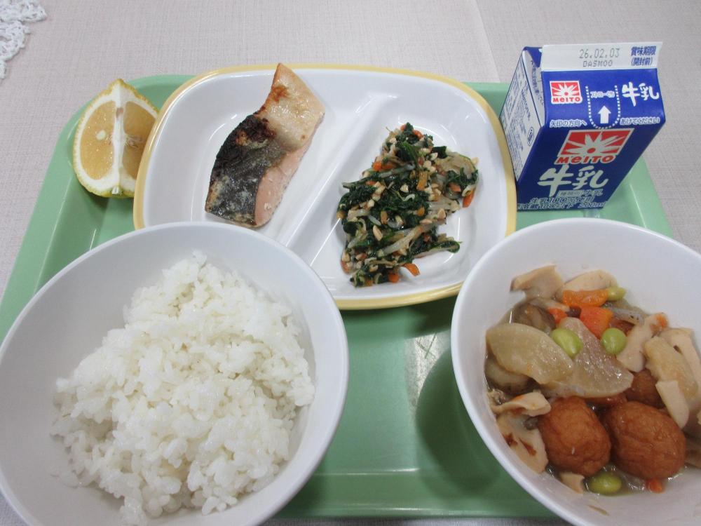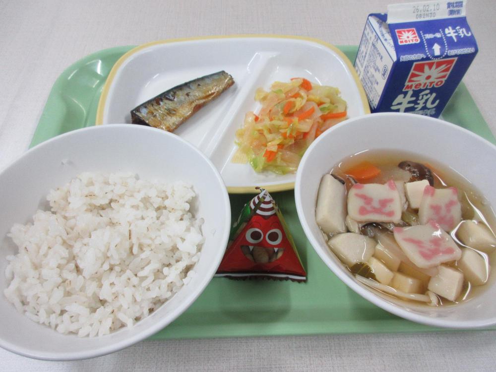 麦ご飯 イワシの生姜煮 鬼退治汁 こんにゃくサラダ 福豆 牛乳
