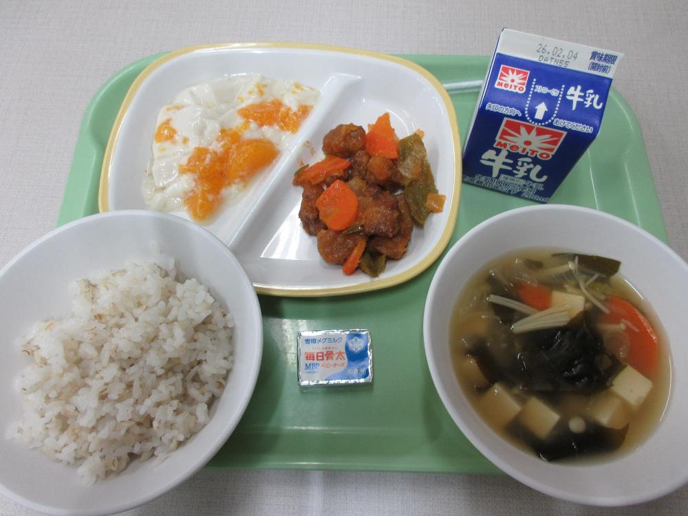 麦ご飯 わかめスープ 酢豚 角切りチーズ みかんのトウファ 牛乳