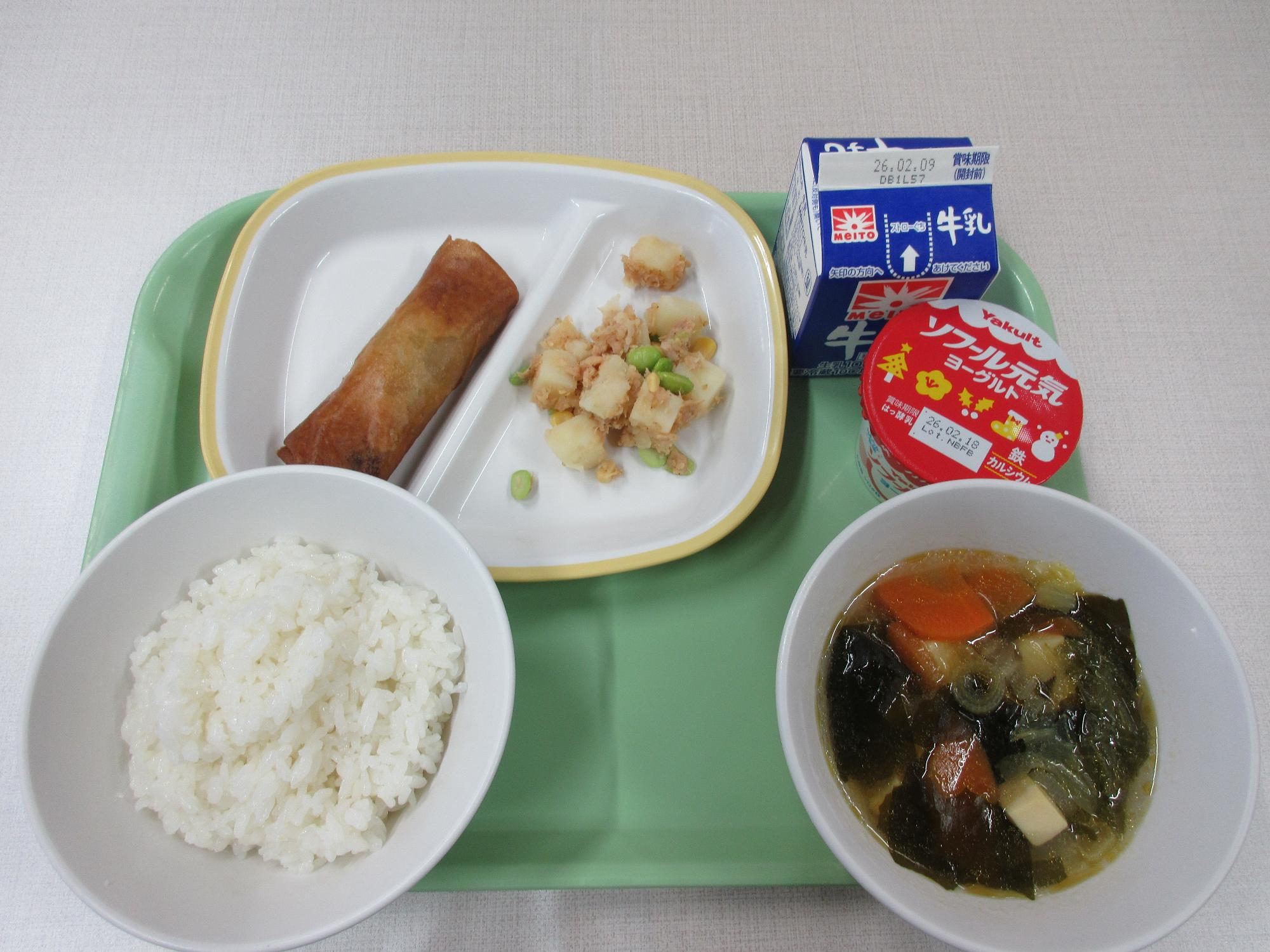 ご飯 春巻き ワカメと豆腐のスープ 中華風ツナポテトサラダ ヨーグルト 牛乳