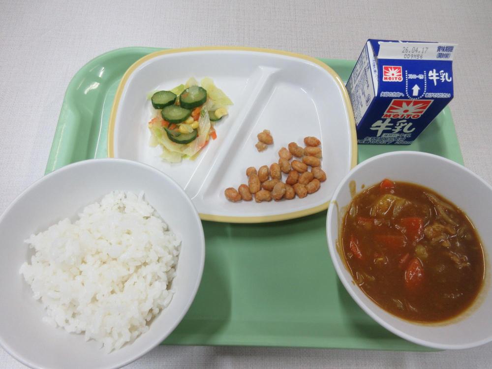 ご飯 ポークカレー ポップビーンズ コーンサラダ 牛乳