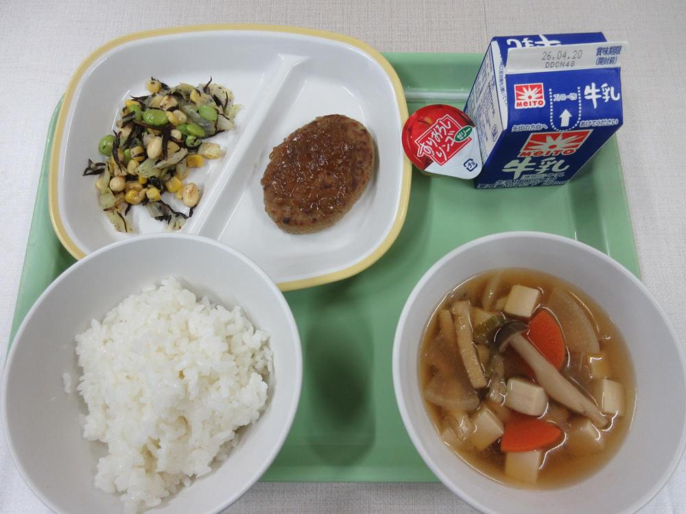 ご飯 具沢山汁 豆ひじきサラダ ハンバーグ玉ねぎソース 牛乳 ミニりんごゼリー