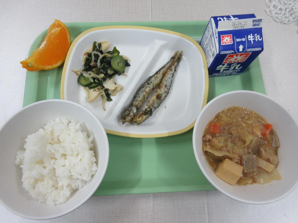 ご飯 シシャモの磯辺揚げ 竹輪とワカメのサラダ 生揚げの味噌煮 不知火 牛乳