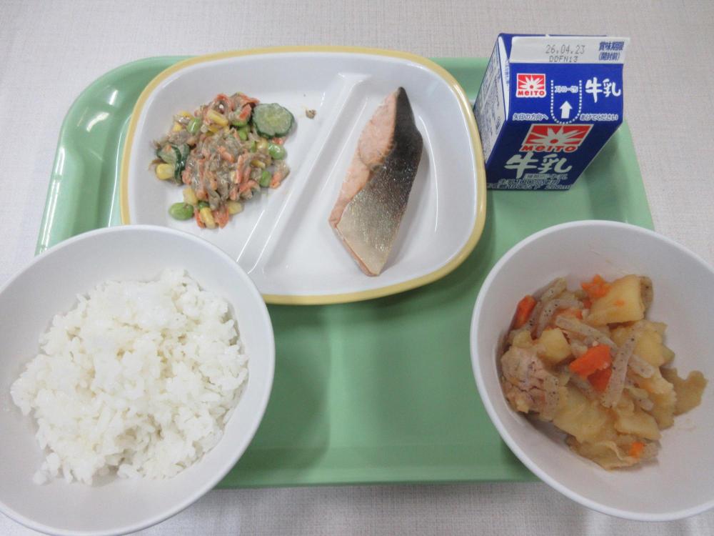 ご飯 鱒の塩焼き 肉じゃが ごぼうマヨサラダ 牛乳