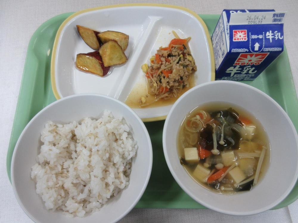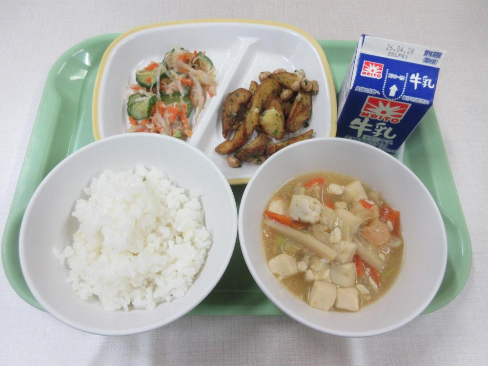 ご飯 豆とポテトの海苔塩揚げ 海老と豆腐のあっさり煮 ツナサラダ 牛乳