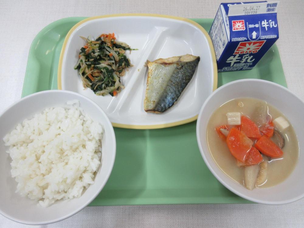 ご飯 鯖のカレー醤油焼き 呉汁 なめ茸和え 牛乳