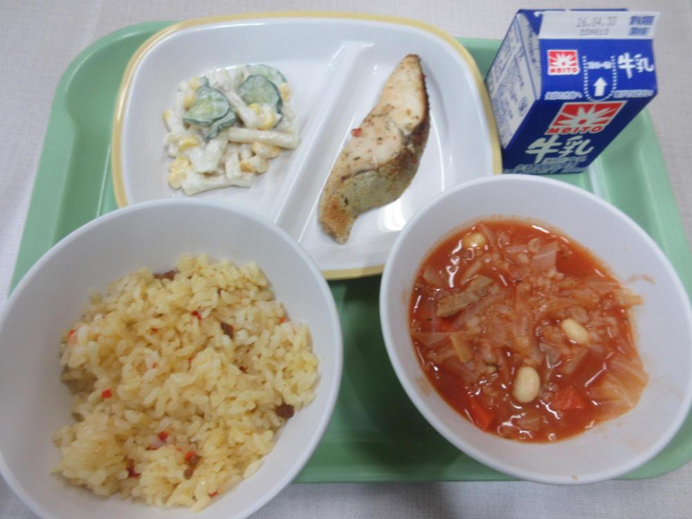 キャロットピラフ 白身魚のハーブスパイス焼き トマトと麦のスープ マカロニサラダ 牛乳