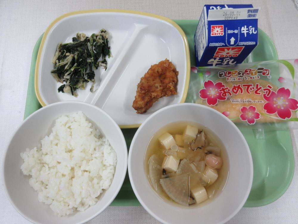 ご飯 鶏のから揚げ おイワシすまし汁 海苔サラダ お祝いクレープ 牛乳