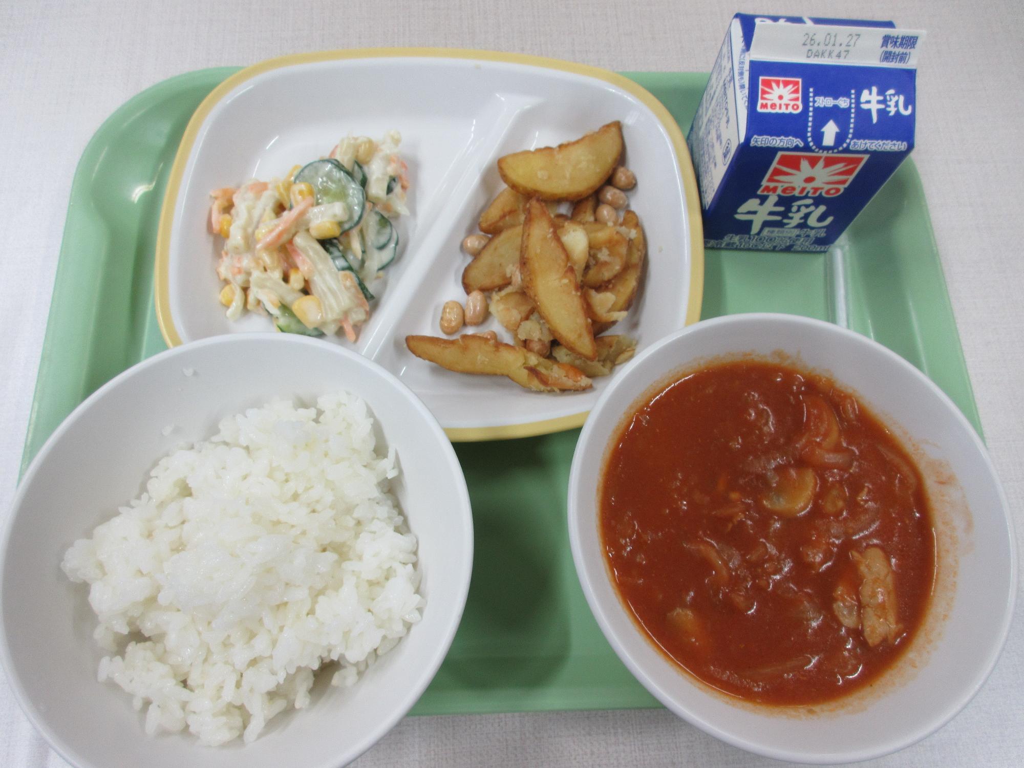 ご飯 豆ポテコンソメ ハヤシソース マカロニサラダ 牛乳