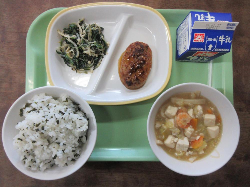 わかめご飯 ハンバーグ照り焼きソース 海老と豆腐のあっさり煮 海苔サラダ 牛乳