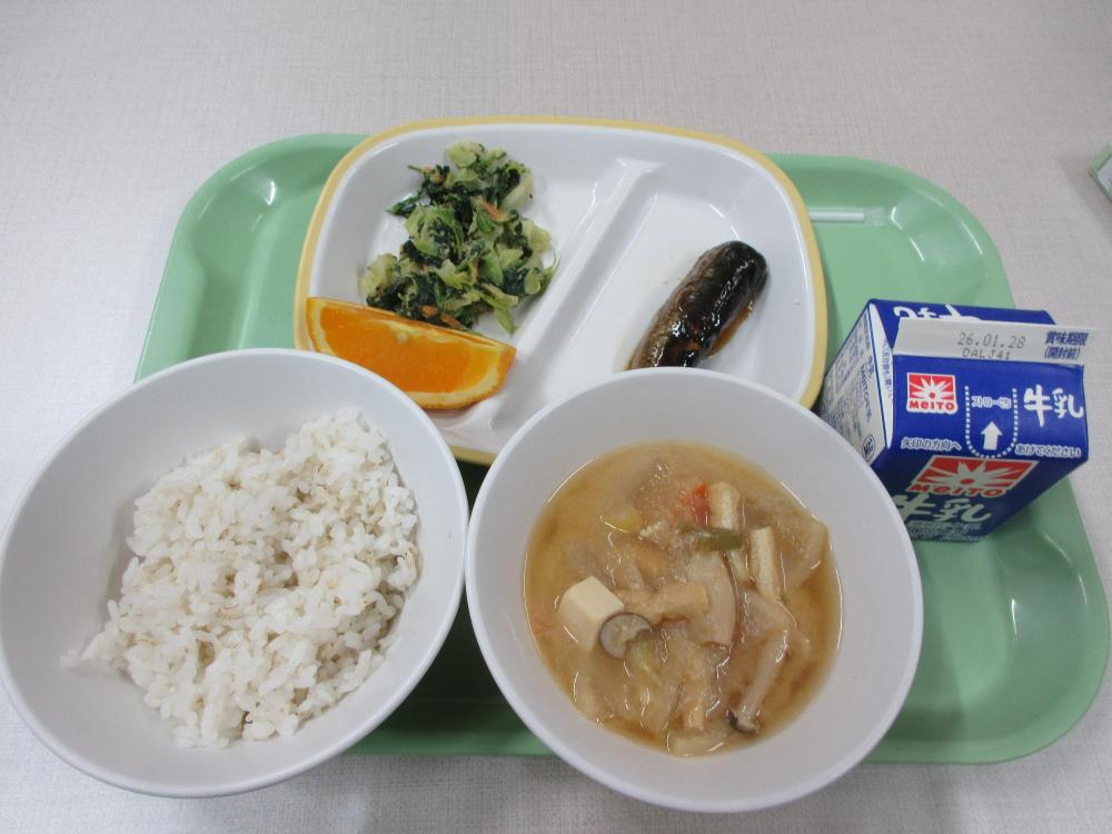 麦ご飯 イワシの生姜煮 胡麻和え 呉汁 オレンジ 牛乳