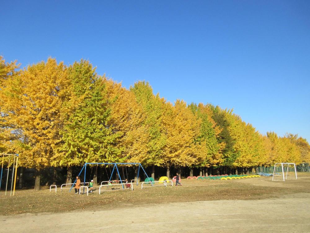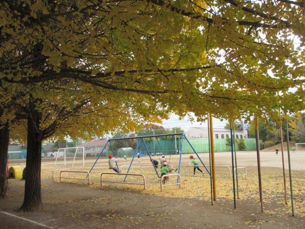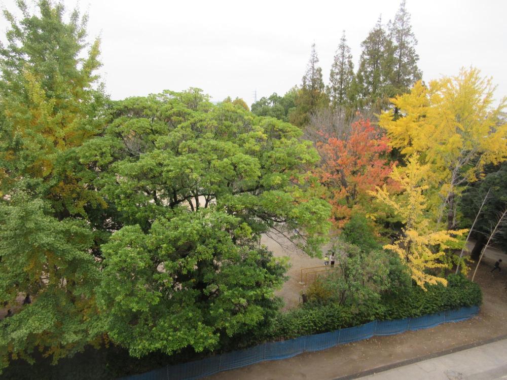 階段の踊り場から校庭を見ると、紅葉がどんどん進んでいることがわかります。