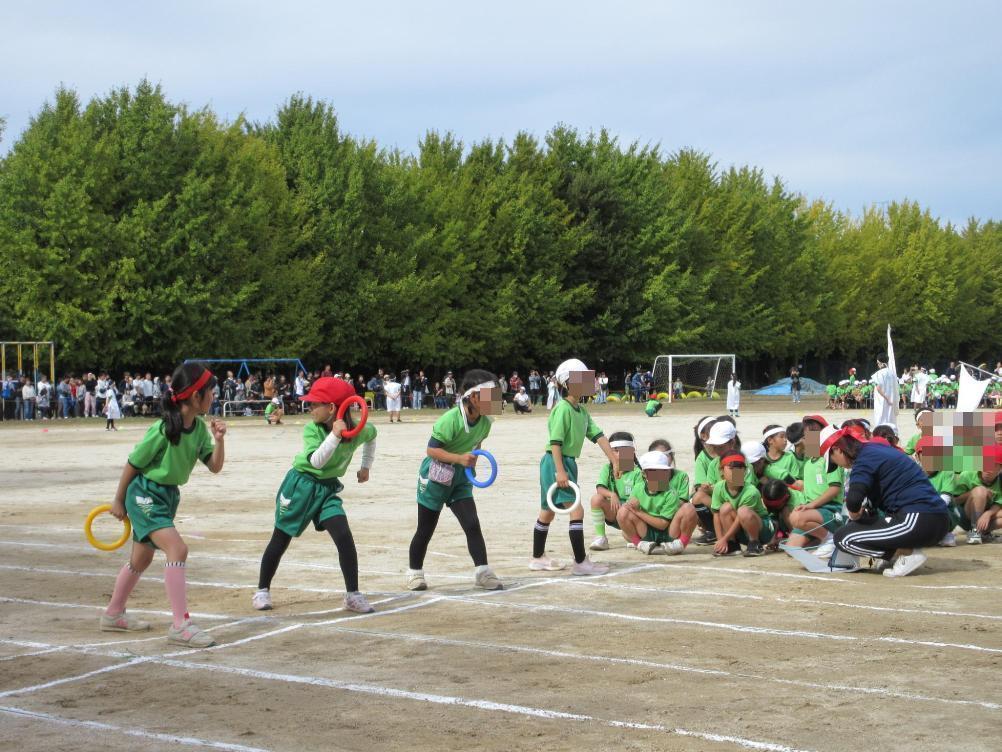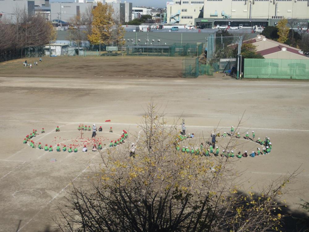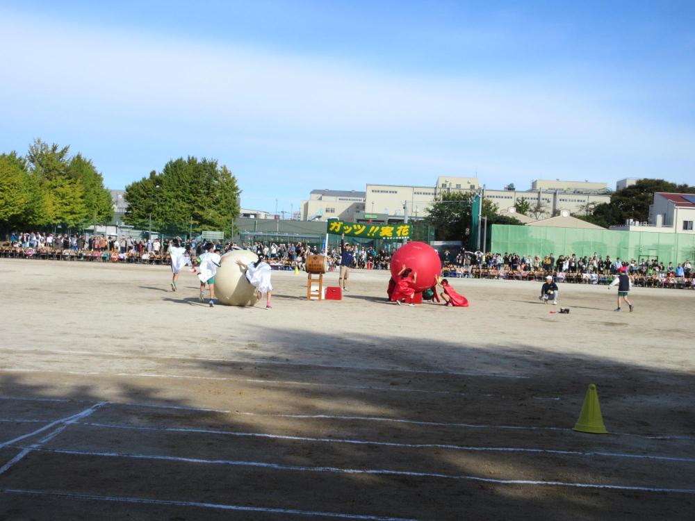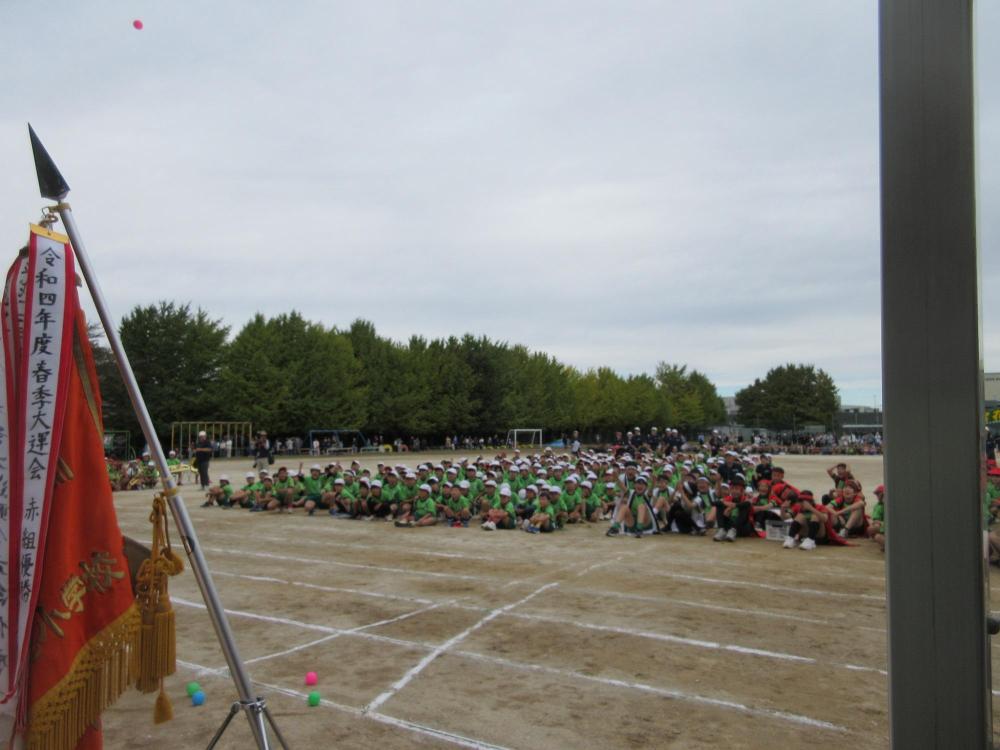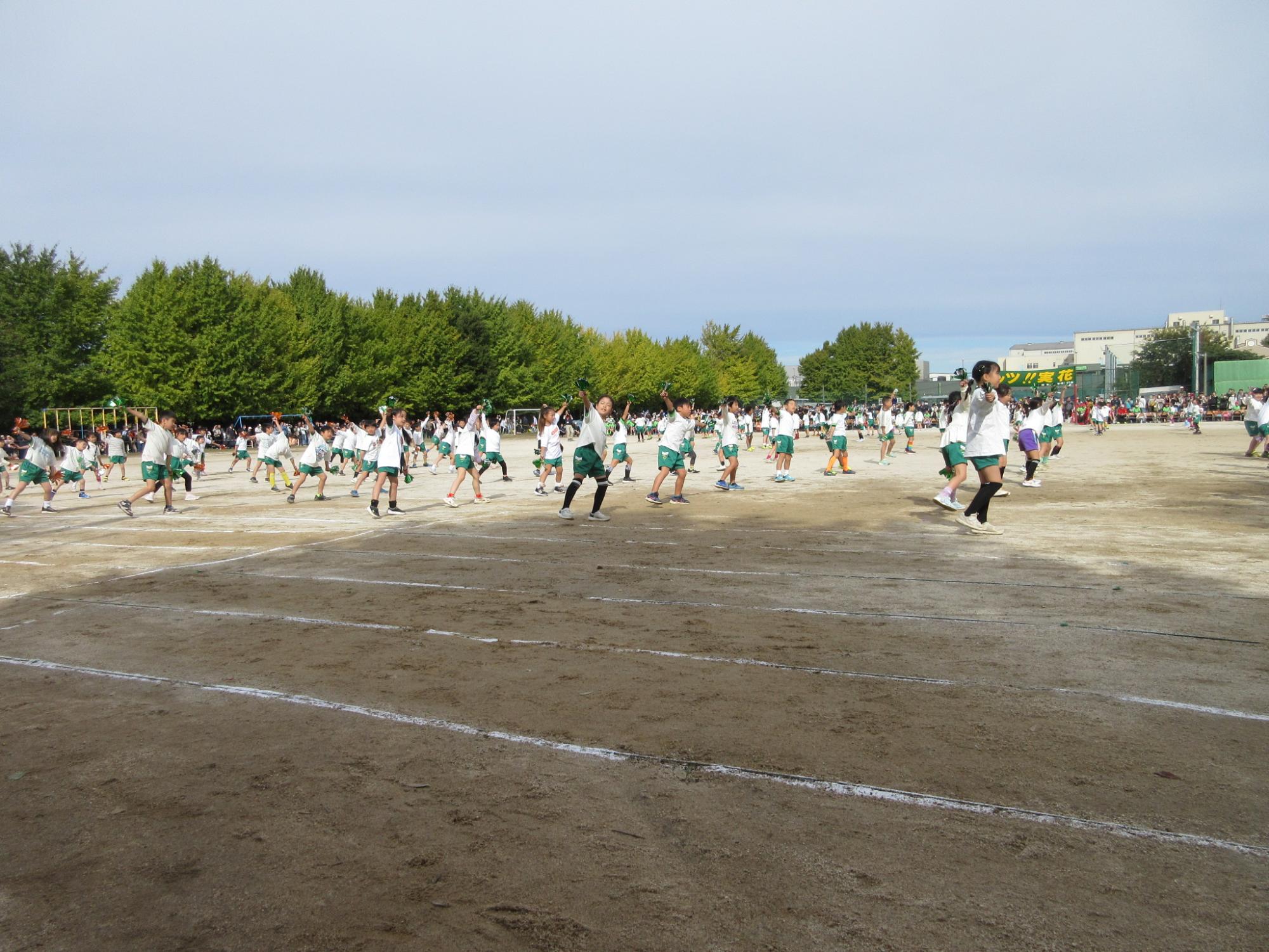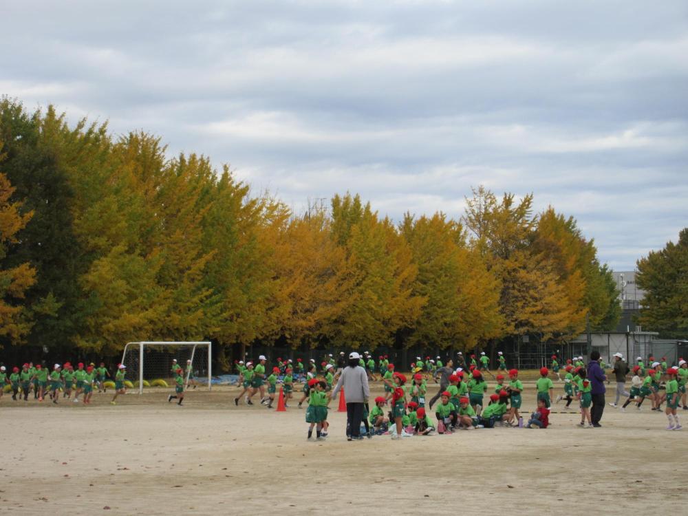 1年生が学年体育で「玉入れ」をしていました。どうやら、白組が勝ったようです。