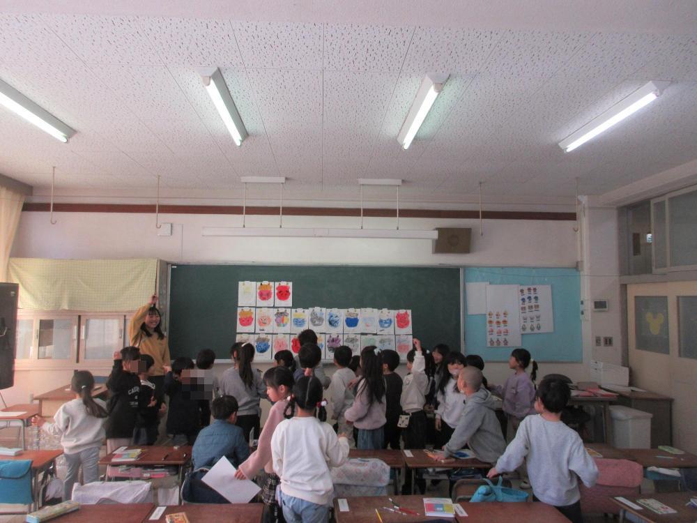 1・2年生が「心の鬼」をワークシートに書き、鬼退治してました。こちらは1年生の学級です。