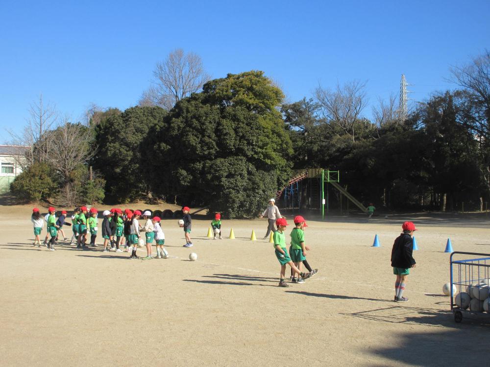 2年生ボール蹴り運動 奥には3年生のポートボール