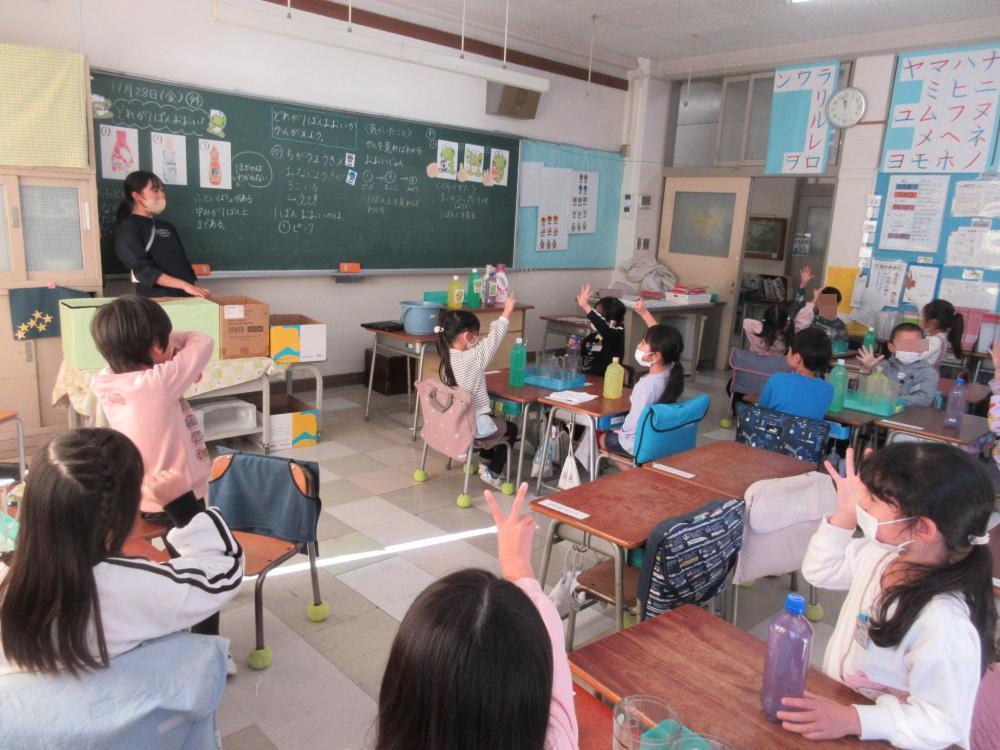1年生算数 「かさ」の学習です。直接比較できない場合はどうするか、考えます。
