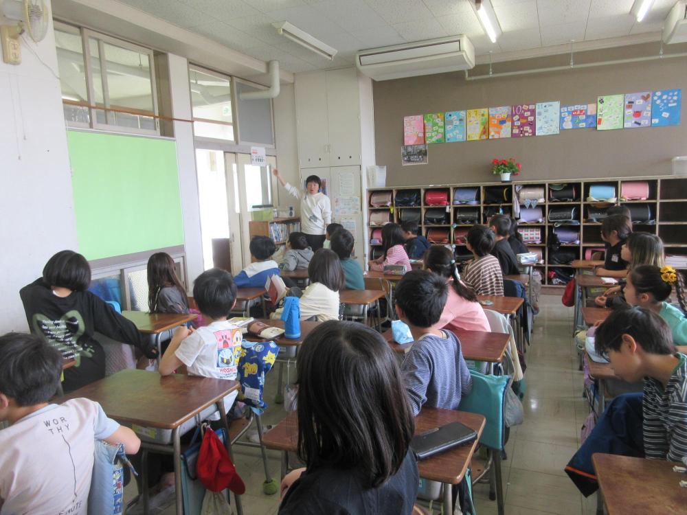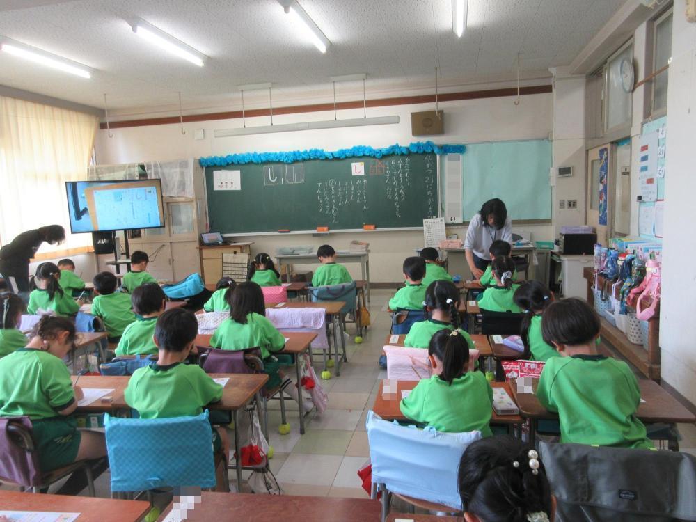 体育で校庭に出たあとの、1年生の教室。整理整頓、ばっちりですね!