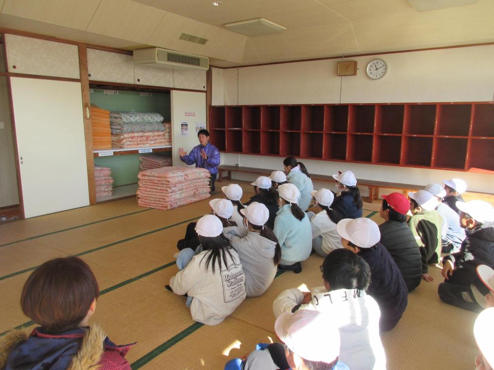 実際に、団の畳み方や整理整頓について説明を受けました。このあと、避難訓練も行いました。