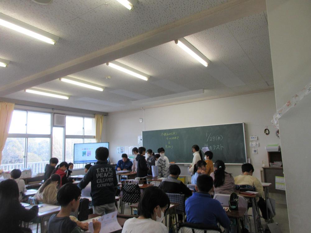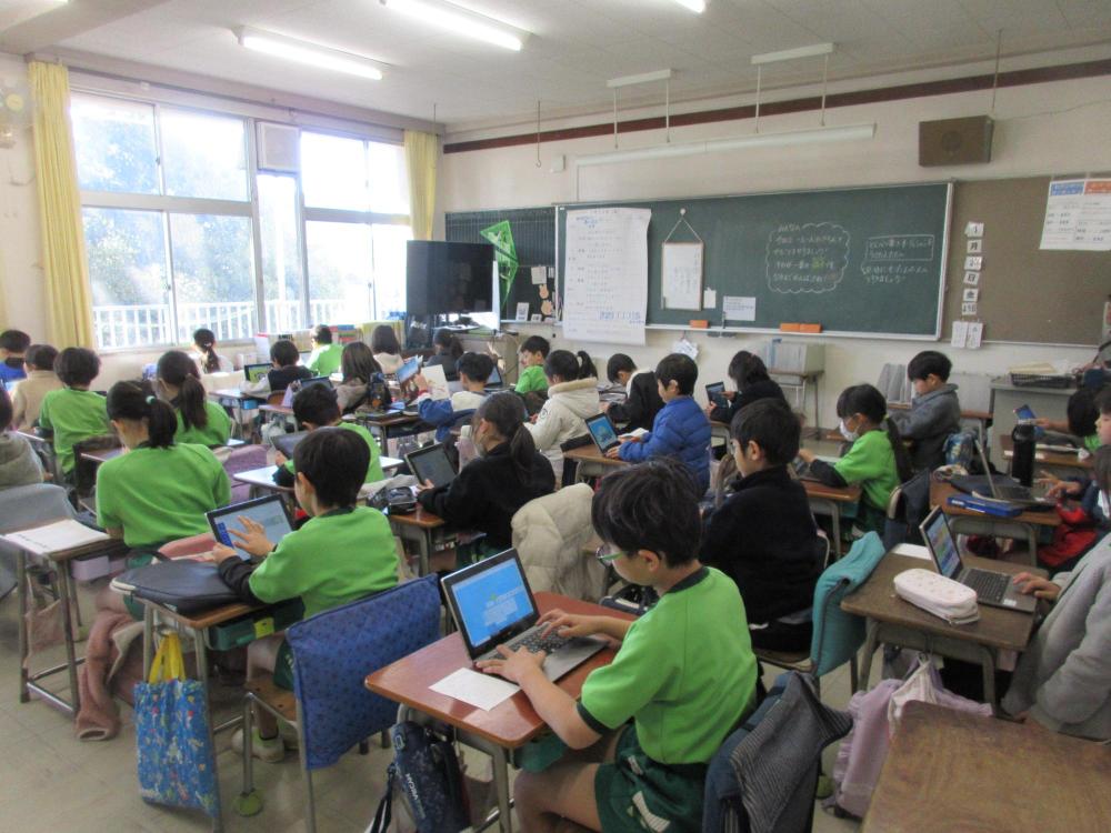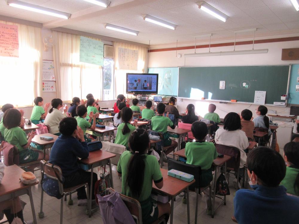 3学期始業式をオンラインで実施しました。校歌を元気よく歌っていました。
