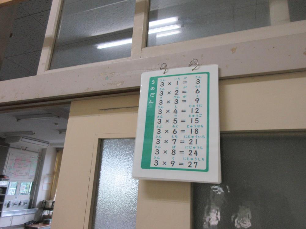 2年生の教室のドアにはかけ算九九の表 これを唱えてから教室に入りましょう!