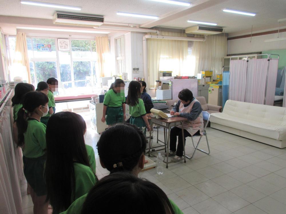1年生 養護教諭の話をよく聞いて、身体計測を受けていました。