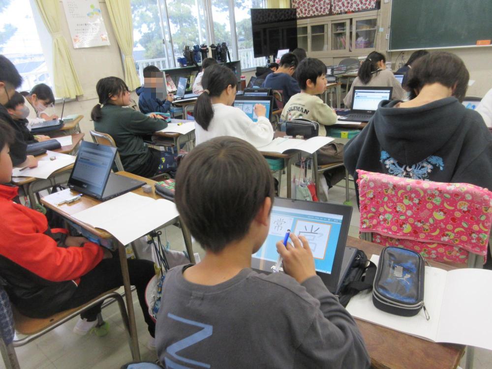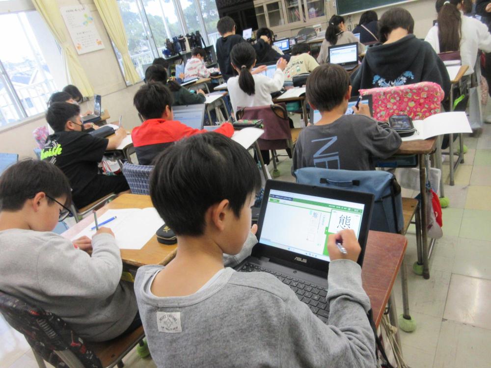 朝の学習で、タブレットを使ってデジタル漢字ドリルに取り組んでいました。