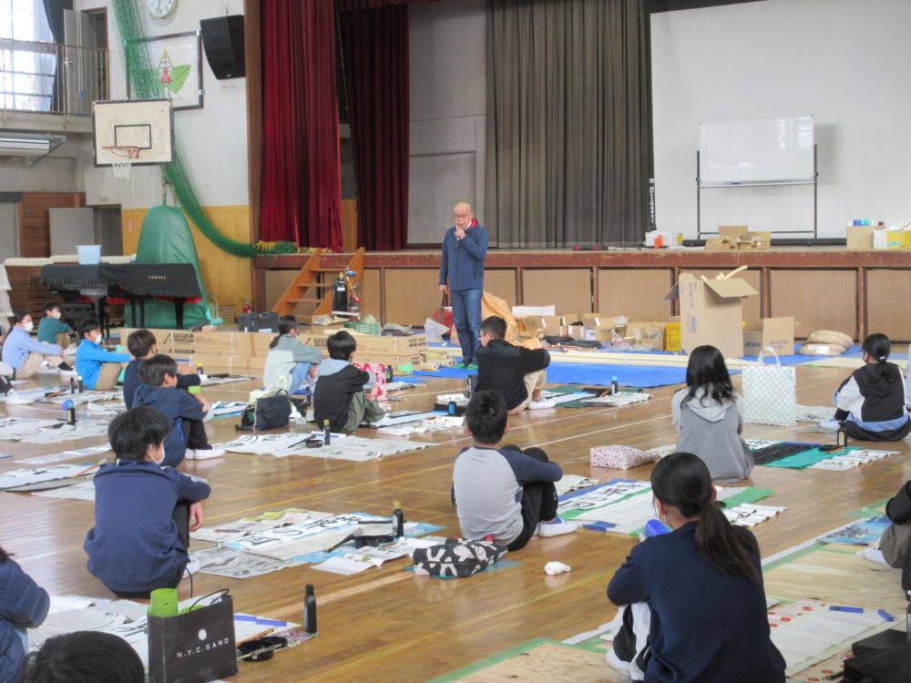 4年生 村田先生の筆の動きを見ながら、注意点について説明を聞きました。