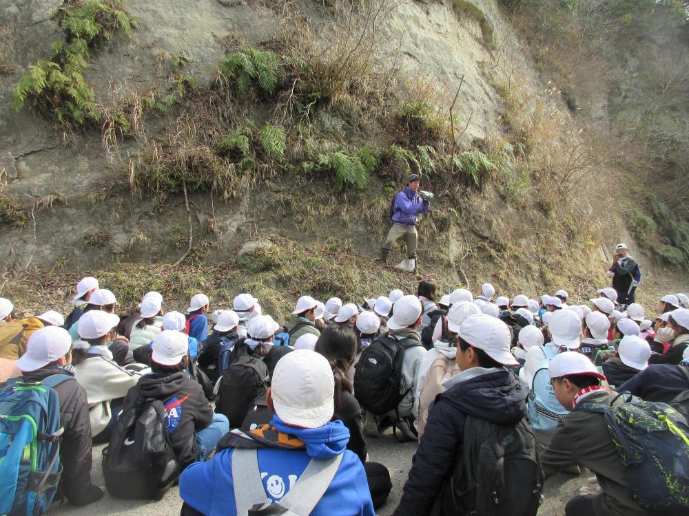 途中で地層の学習をしました。断層をみて、皆驚きの声を発していました。