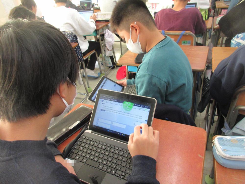 第2学期終業式をオンラインで行いました。校歌を元気よく歌っています。