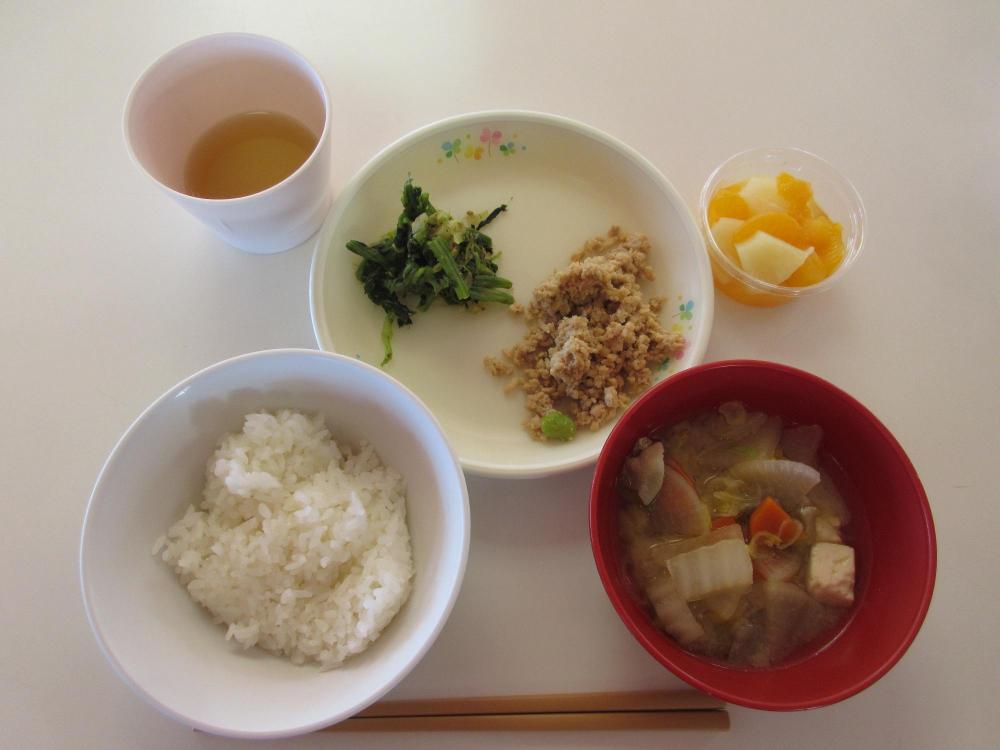 お昼はそぼろご飯。豚汁が具沢山で美味しかったです。