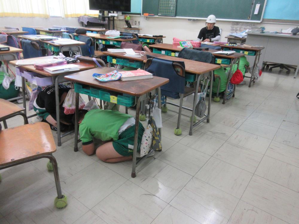 避難訓練開始 まずは机の下で頭を守り、揺れが収まるのを待ちます。
