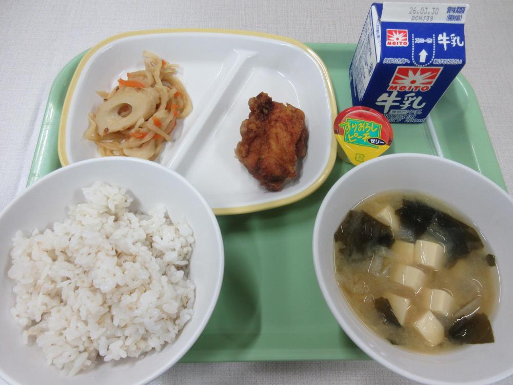麦ご飯 ワカメと豆腐の味噌汁 切り干し大根 唐揚げ ミニゼリー 牛乳