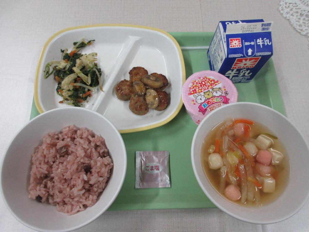 お赤飯 ゴマ塩 ハンバーグ照り焼きソース お祝いすまし汁 おかか和え お祝いデザート 牛乳