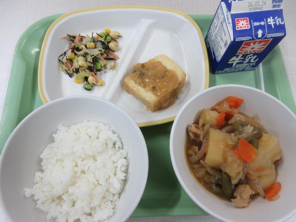 ご飯 豆腐ステーキねぎ味噌だれ 肉じゃが 豆ひじきサラダ 牛乳