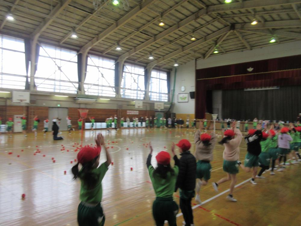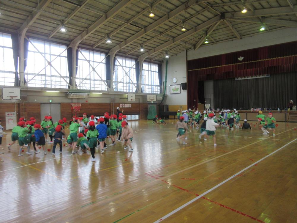 1年生が学年体育をしていました。楽しくダンシング玉入れ♪