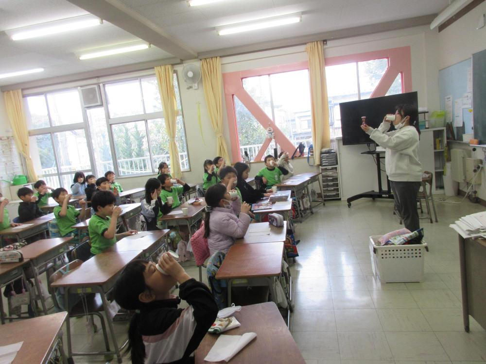2年生 朝のフッ化物洗口の様子です。虫歯のない歯をめざしましょう!