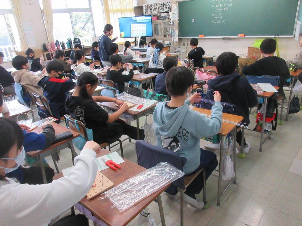 2年生図工 カッターを使って製作中。だんだん完成に近づいてます。