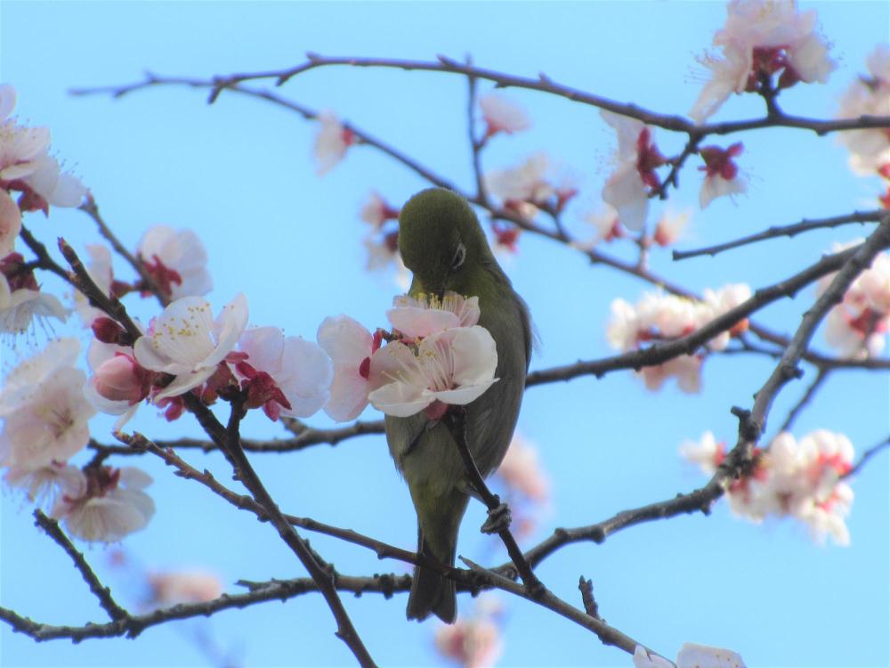 校庭の「あんずの木」に目白が来ていました。枝から枝へ飛び移りつつ、蜜を吸ってました。